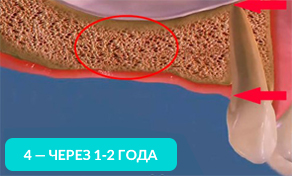 На 4-ом рисунке видно, что костная ткань стала значительно тоньше, теперь в это место уже невозможно установить импланты (потребуется операция по наращиванию костной ткани).